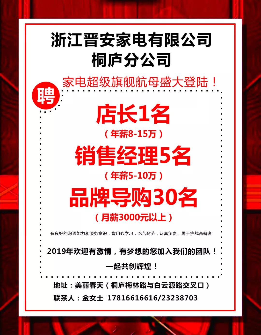 親愛的求職者們,趕快拿起電話,撥打我們的招聘熱線,或者發(fā)送你的簡歷到我們的郵箱,讓我們一起踏上這段探索自然美景的旅程,一起尋找內(nèi)心的平靜和滿足,在桐廬十九樓,你將找到工作的樂趣、生活的意義,我們期待你的加入,一起創(chuàng)造更多的美好未來!